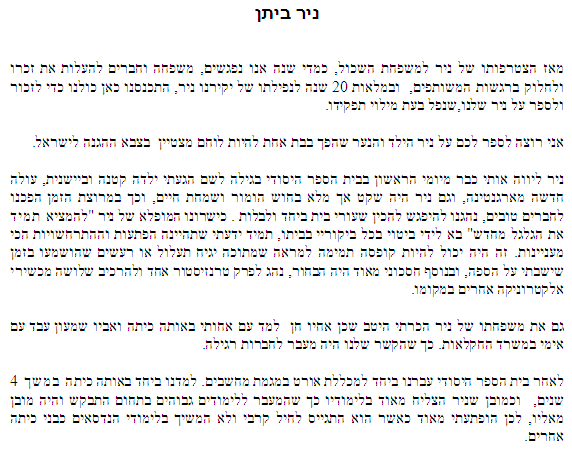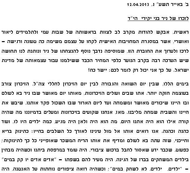 כמידי שנה, באזכרה השנתית שנערכת בהר הרצל, נאמרים ע"י האב, שמעון, מספר מילים לזכרו של ניר ביתן ז"ל